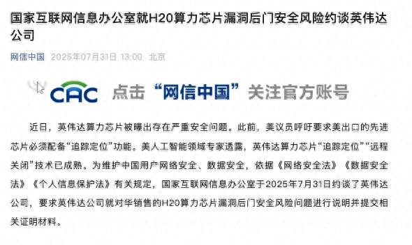 为维护中国用户网络安全、数据安全,依据《网络安全法》《数据安全法》《个人信息保护法》有关规定,国家互联网信息办公室于7月31日约谈了英伟达公司,要求英伟达公司就对华销售的H20算力芯片漏洞后门安全风险问题进行说明并提交相关证明材料。